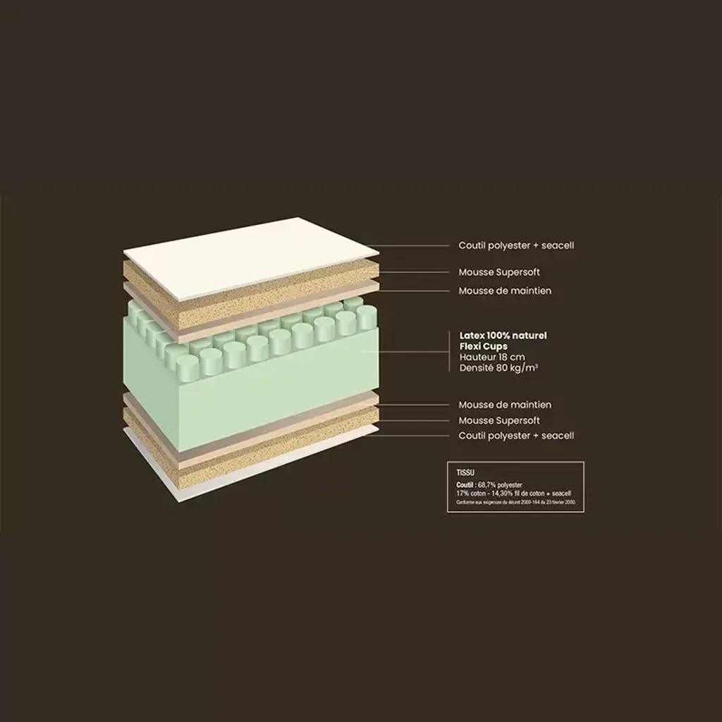 另外床墊還採用 18 公分長的 100% 天然乳膠和 80 公斤/立方米的密度,提供持久的支撐,同時適用各種體型。加上床墊的高透氣性不易悶熱,創造了一個有利於安寧睡眠的環境。
